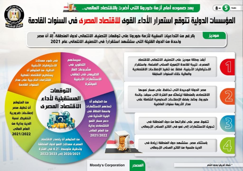 كما توقعت وكالة موديز أن يتصدر الاقتصاد المصرى معدلات النمو لدول المنطقة وأن يحقق متوسط 4.2% فى الفترة من 2020 / 2021 إلى 2022/2023، فضلاً عن توقع الوكالة تطبيق مصر إصلاحات ضرورية لتخفيض نسبة الدين بداية من العام المالى 2021 / 2022.