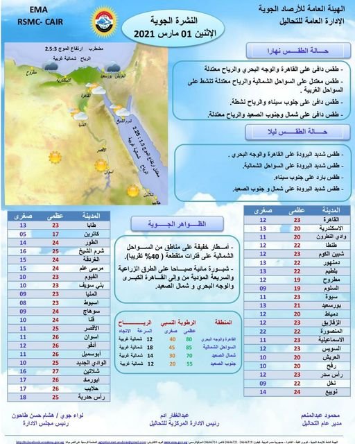 كما تتوقع هيئة الأرصاد، أن يسود طقس دافئ على شمال الصعيد، وطقس دافئ على جنوب الصعيد والرياح معتدلة.