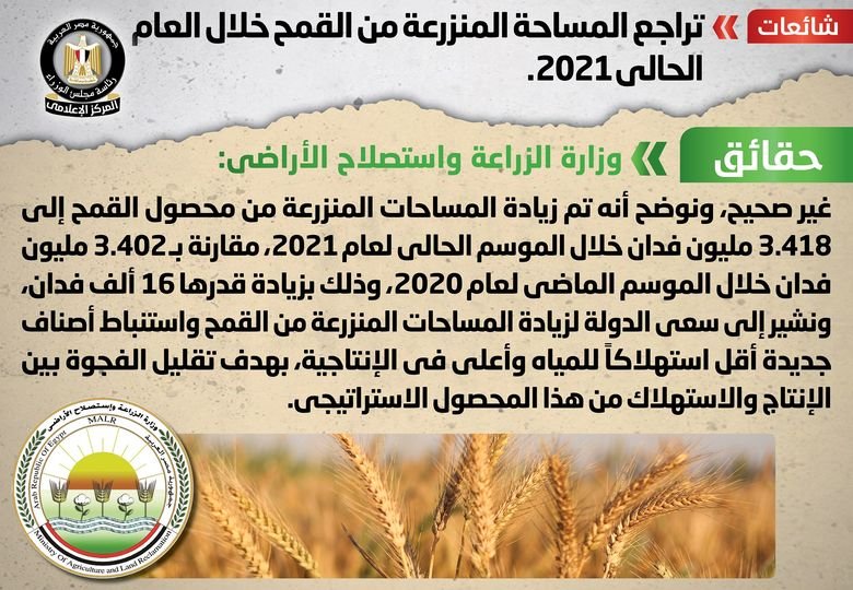وقد قام المركز الإعلامي لمجلس الوزراء بالتواصل مع وزارة الزراعة واستصلاح الأراضي، والتي نفت تلك الأنباء، مُؤكدةً أنه لا صحة لتراجع المساحة المنزرعة من القمح خلال العام الحالي 2021.