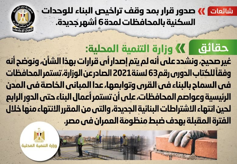 وقد قام المركز الإعلامي لمجلس الوزراء بالتواصل مع وزارة التنمية المحلية، والتي نفت تلك الأنباء، مُؤكدةً أنه لا صحة لصدور قرار بمد وقف تراخيص البناء للوحدات السكنية بالمحافظات لمدة 6 أشهر جديدة، وأنه لم يتم إصدار أي قرارات بهذا الشأن، مُوضحةً أنه وفقاً للكتاب الدوري رقم 63 لسنة 2021 الصادر عن الوزارة، تستمر المحافظات في السماح بالبناء في القرى وتوابعها، عدا المباني الخاصة في المدن الرئيسية وعواصم المحافظات، على أن تستمر أعمال البناء حتى الدور الرابع لحين انتهاء الاشتراطات البنائية الجديدة، والتي من المقرر الانتهاء منها خلال الفترة المقبلة بهدف ضبط منظومة العمران في مصر.