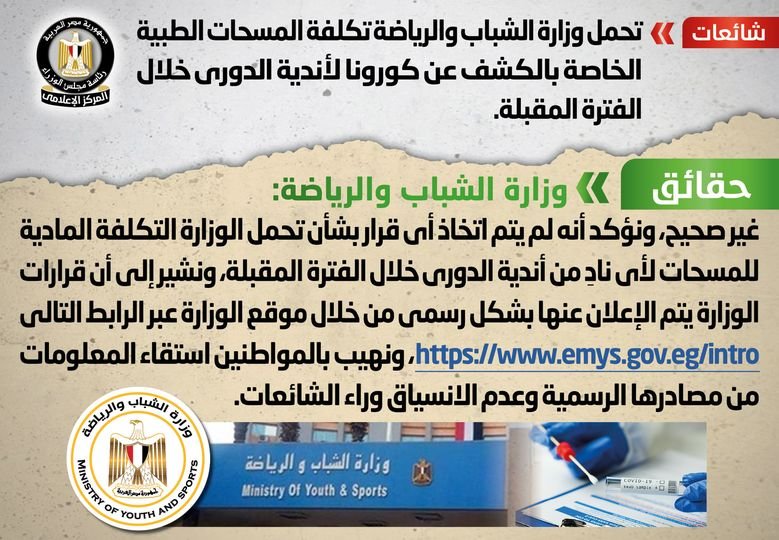 وقد قام المركز الإعلامي لمجلس الوزراء بالتواصل مع وزارة الشباب والرياضة، والتي نفت تلك الأنباء، مُؤكدةً أنه لا صحة لتحمل وزارة الشباب والرياضة تكلفة المسحات الطبية الخاصة بالكشف عن كورونا لأندية الدوري خلال الفترة المقبلة، وأنه لم يتم اتخاذ أي قرار بشأن تحمل الوزارة التكلفة المادية للمسحات لأي نادِ من أندية الدوري خلال الفترة المقبلة.
