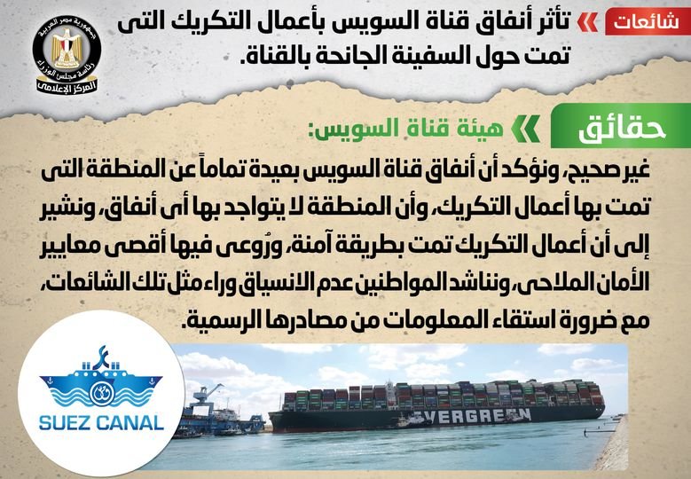 وقد قام المركز الإعلامي لمجلس الوزراء بالتواصل مع هيئة قناة السويس، والتي نفت تلك الأنباء، مُؤكدةً أنه لا صحة لتأثر أنفاق قناة السويس بأعمال التكريك التي تمت حول السفينة الجانحة بالقناة، مُوضحةً أن أنفاق قناة السويس بعيدة تماماً عن المنطقة التي تمت بها أعمال التكريك، وأن المنطقة لا يتواجد بها أي أنفاق، مُشيرةً إلى أن أعمال التكريك تمت بطريقة آمنة، وروعي فيها أقصى معايير الأمان الملاحي، مُناشدةً المواطنين عدم الانسياق وراء مثل تلك الشائعات، مع ضرورة استقاء المعلومات من مصادرها الرسمية.