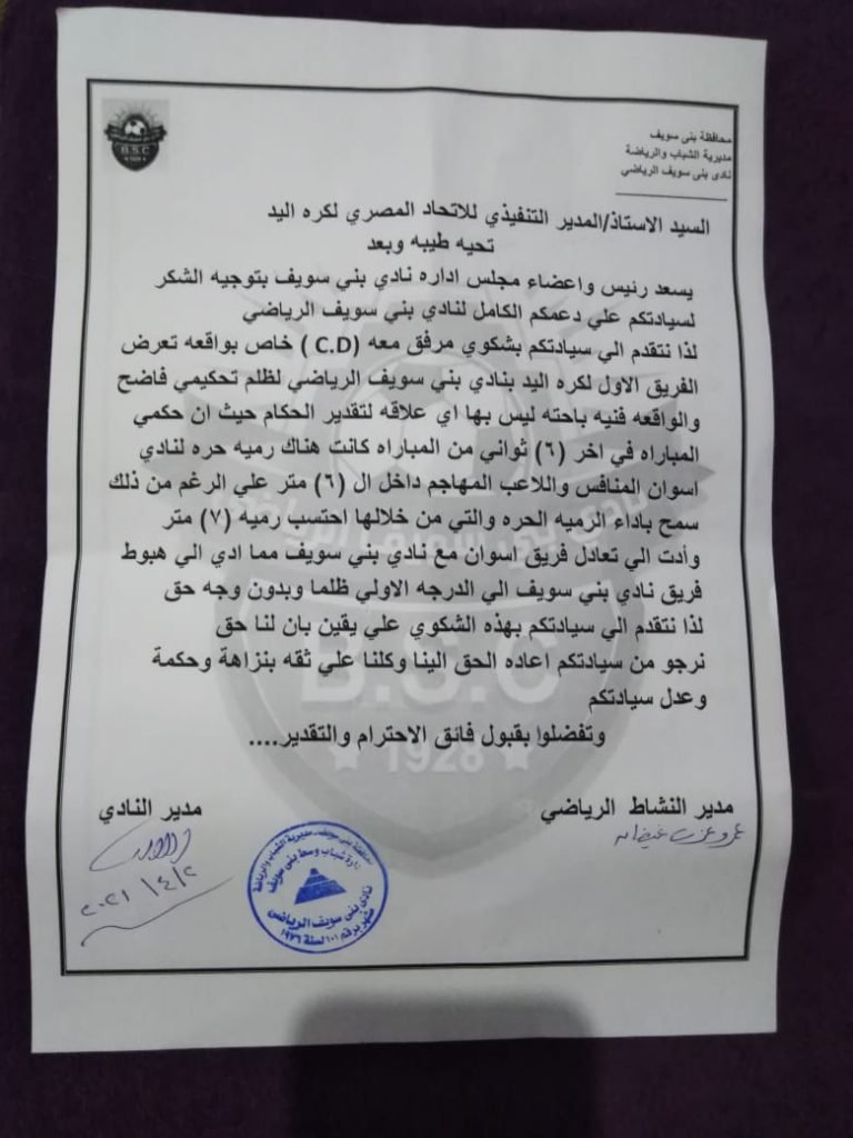 تقدم مجلس إدارة نادى بنى سويف الرياضى برئاسة المحاسب على سليم ، بشكوى رسمية للاتحاد المصرى لكرة اليد للمطالبة بإعادة مباراة الفريق السويفى أمام اسوان لوجود أخطاء تحكيم فادحة .