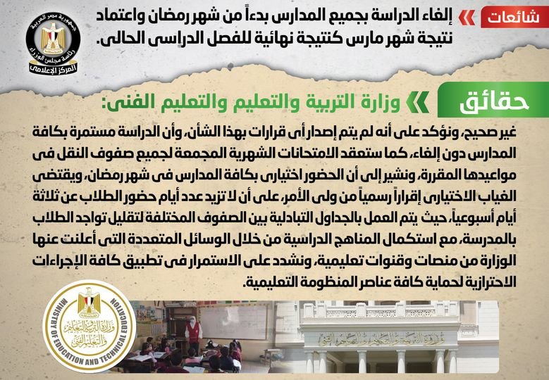 وقد قام المركز الإعلامي لمجلس الوزراء بالتواصل مع وزارة التربية والتعليم والتعليم الفني، والتي نفت تلك الأنباء، مُؤكدةً أنه لا صحة لإلغاء الدراسة بجميع المدارس بدءاً من شهر رمضان أو اعتماد نتيجة شهر مارس كنتيجة نهائية للفصل الدراسي الحالي، وأنه لم يتم إصدار أي قرارات بهذا الشأن، مُوضحةً أن الدراسة مستمرة بكافة المدارس دون إلغاء، كما ستعقد الامتحانات الشهرية المجمعة لجميع صفوف النقل في مواعيدها المقررة.