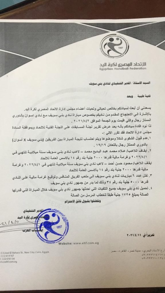 وأكد الاتحاد المصري لكرة اليد أنه تم عرض تقرير لجنة المسابقات على اللجنة الفنية للاتحاد وبموافقة مجلس إدارة الاتحاد قرر: عدم قبول الشكوى شكلا وموضوعا ويتم احتساب نتيجة المباراة بين الفريقين ( بنى سويف – أسوان ) بالدورى الممتاز رجال بنتيجة 19/19 .