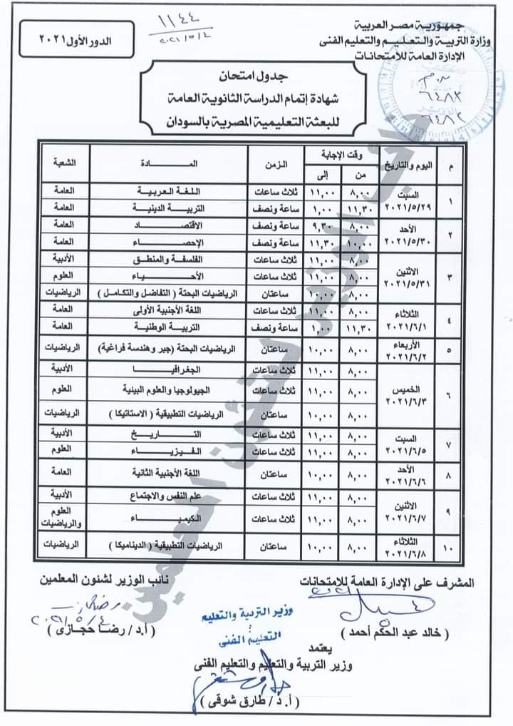 اعتمد الدكتور طارق شوقى وزير التربية والتعليم والتعليم الفني، جدول امتحان الدور الأول 2021 لشهادة إتمام الدراسة الثانوية العامة لطلاب مدارس البعثة التعليمية المصرية بالسودان.