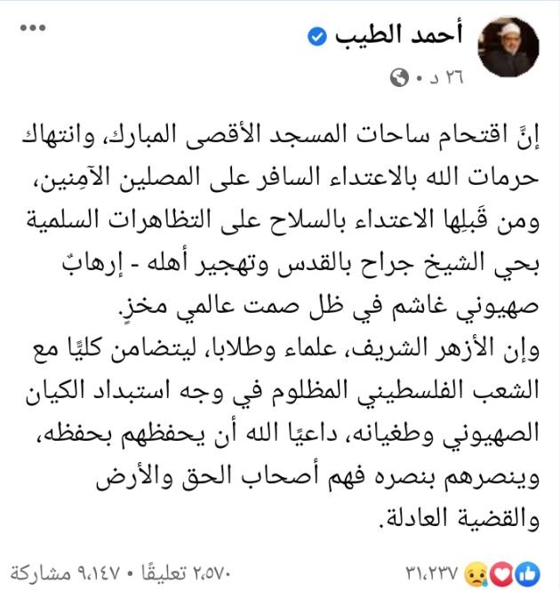 وقال فضيلته في تدوينة على صفحته الرسمية بموقع التواصل الاجتماعي (فيسبوك): إنَّ اقتحام ساحات المسجد الأقصى المبارك، وانتهاك حرمات الله بالاعتداء السافر على المصلين الآمِنين، ومن قَبلِها الاعتداء بالسلاح على التظاهرات السلمية بحي الشيخ جراح بالقدس وتهجير أهله – إرهابٌ صهيوني غاشم في ظل صمت عالمي مخزٍ.