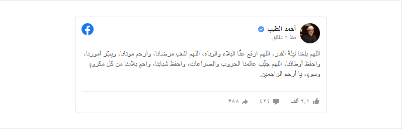 وقال شيخ الأزهر في منشور له: «للهم بلغنا ليلةَ القدر، اللهم ارفع عنَّا البلاء والوباء، اللهم اشفِ مرضانا، وارحم موتانا، ويسِّر أمورنا، واحفظ أوطانَنا، اللهم جنِّب عالمنا الحروب والصراعات، واحفظ شبابنا، واحمِ بلادنا من كل مكروهٍ وسوءٍ، يا أرحم الراحمين».