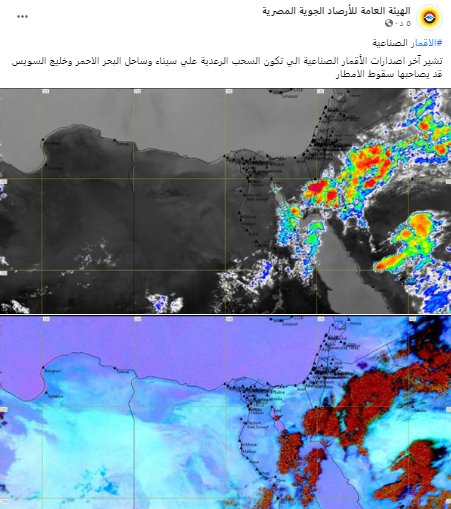 وقالت هيئة الأرصاد الجوية، في منشور لها: «تشير آخر اصدارات الأقمار الصناعية الي تكون السحب الرعدية علي سيناء وساحل البحر الاحمر وخليج السويس قد يصاحبها سقوط الامطار».