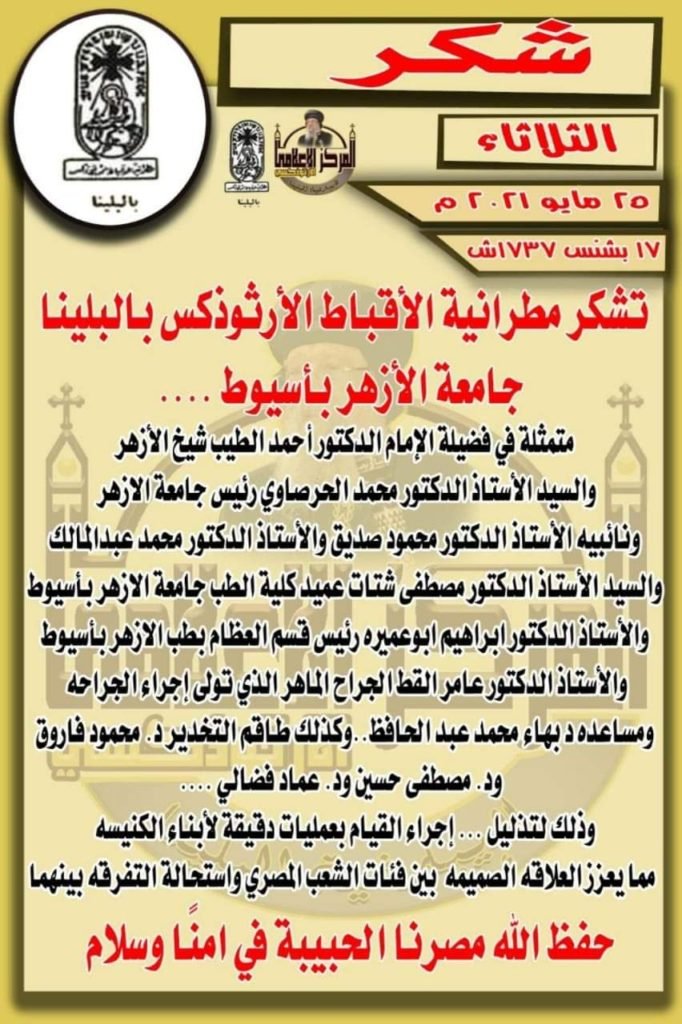 من ناحية أخرى وجهت مطرانية الأقباط الأرثوذكس بالبلينا، بمحافظة سوهاج الشكر إلى مؤسسة الأزهر الشريف جامعًا وجامعةً برئاسة فضيلة الإمام الأكبر الدكتور أحمد الطيب شيخ الأزهر، وسعادة الدكتور محمد المحرصاوي رئيس الجامعة، والدكتور محمود صديق نائب رئيس الجامعة للدراسات العليا والبحوث، المشرف العام على قطاع المستشفيات الجامعية بجامعة الأزهر، والدكتور محمد عبد المالك نائب رئيس الجامعة لشئون الوجه القبلي بأسيوط، والدكتور مصطفى عبده شتات، عميد كلية الطب بنين جامعة الأزهر بأسيوط، والدكتور إبراهيم أبو عميرة رئيس قسم جراحة العظام بمستشفى جامعة الأزهر بأسيوط، والدكتور عامر القط، جراح العظام، ومساعدة الدكتور بهاء محمد عبد الحافظ، إضافة إلى توجيه الشكر لطاقم التخدير، الدكتور محمود فاروق، الدكتور مصطفى حسين، الدكتور عماد فضالي، لقيامهم بإجراء عمليات جراحية لأبناء الكنيسة، مما يعزز العلاقة الصميم بين فئات الشعب واستحالة التفرقة بينهم.