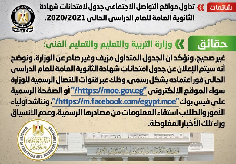 وقد قام المركز الإعلامي لمجلس الوزراء بالتواصل مع وزارة التربية والتعليم والتعليم الفني، والتي نفت تلك الأنباء، مُؤكدةً أنه لا صحة للجدول المتداول لامتحانات شهادة الثانوية العامة للعام الدراسي الحالي 2020/2021، وأن الجدول المتداول مزيف وغير صادر عن الوزارة.