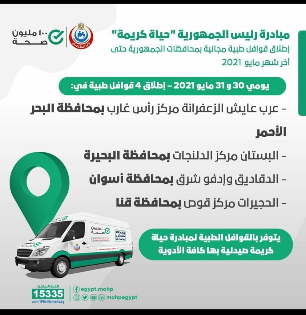 تقوم وزارة الصحة والسكان بإطلاق 4 قوافل طبية، ضمن مبادرة رئيس الجمهورية حياة كريمة، وذلك يومي30 و 31 مايو، للكشف والعلاج مجانًا، في التخصصات الطبية التالية: (نساء وولادة – خدمات تنظيم الأسرة – الباطنة – الأطفال – الأنف والأذن – العظام – الجراحة – الرمد – الأسنان – القلب – الجلدية – خدمات الأشعة والتحاليل)، في محافظات: البحر الأحمر – البحيرة – أسوان – قنا.