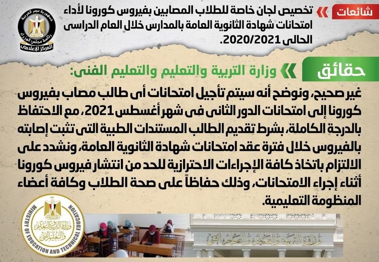 وقد قام المركز الإعلامي لمجلس الوزراء بالتواصل مع وزارة التربية والتعليم والتعليم الفني، والتي نفت تلك الأنباء، مُؤكدةً أنه لا صحة لتخصيص لجان خاصة للطلاب المصابين بفيروس كورونا لأداء امتحانات شهادة الثانوية العامة بالمدارس خلال العام الدراسي الحالي 2020/2021، مُوضحةً أنه سيتم تأجيل امتحانات أي طالب مصاب بفيروس كورونا إلى امتحانات الدور الثاني في شهر أغسطس 2021، مع الاحتفاظ بالدرجة الكاملة، بشرط تقديم الطالب المستندات الطبية التي تثبت إصابته بالفيروس خلال فترة عقد امتحانات شهادة الثانوية العامة، مُشددةً على الالتزام باتخاذ كافة الإجراءات الاحترازية للحد من انتشار فيروس كورونا أثناء إجراء الامتحانات، وذلك حفاظاً على صحة الطلاب وكافة أعضاء المنظومة التعليمية.