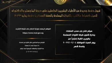 قبول دفعة جديدة من الأطباء البشريين الحاصلين على درجة الماجستير والدكتوراه للعمل كضباط مكلفين بالقوات المسلحة