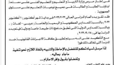 التعليم: اتخاذ الاجراءات القانونية ضد المدارس التى تخالف مواعيد بدء العام الدراسي الجديد