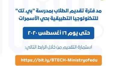 مد فترة التقديم لمدرسة “بي.تك BTECH” حتى ١٦ اغسطس